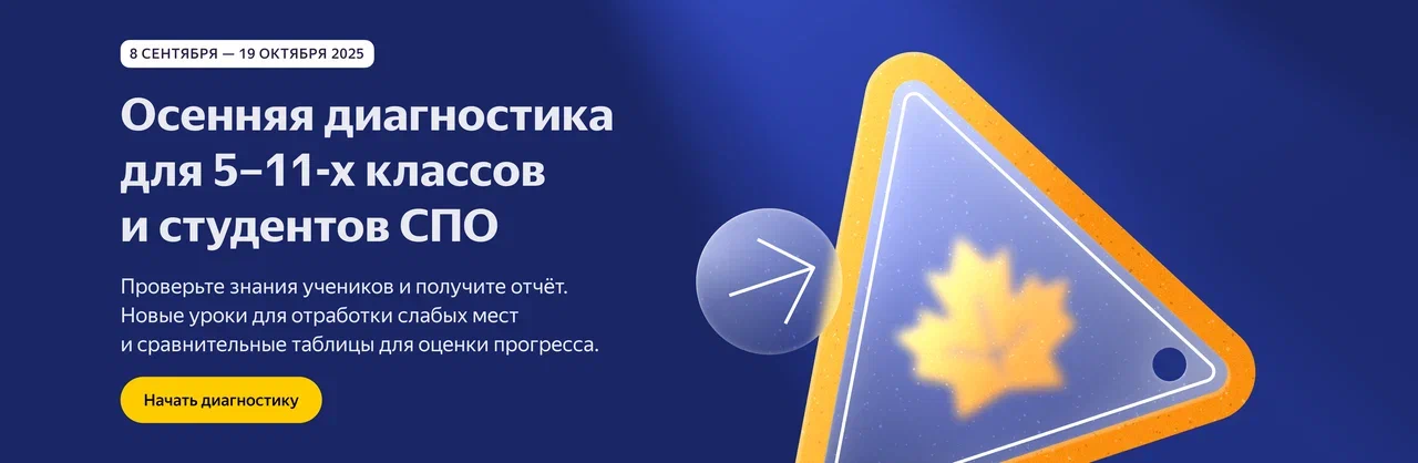 С 8 сентября по 19 октября Яндекс Учебник проводит осеннюю диагностику по информатике. Она поможет учителям и преподавателям проверить знания учеников 5– 11-х классов и студентов СПО.